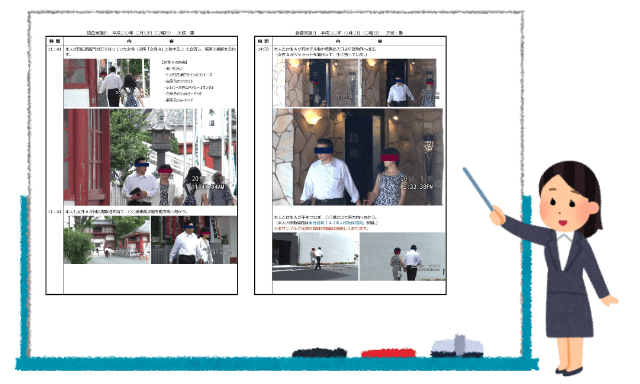例えば「〇月〇日19時10分、〇〇駅前で対象者と異性が合流し、20時5分に〇〇ホテルに入室、22時50分に退室」といった具体的な行動記録と写真をセットで記載。